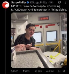 Philly has a new entry in the right wing rage bait streamer category, 23 year old Frank Scales. This is a very brief introduction to Frank; something more comprehensive will come soon from this blog. For now we’ll just expose Frank Scales lying about a recent incident. On Saturday January 10th Frank posted a video from his Surge Philly accounts spread across social media platforms of himself in an ambulance. Doing his best Andy Ngo impersonation, Frank Scales states “we don’t know if there’s bleach in it. We don’t know what they put in the solution that they sprayed at me”.